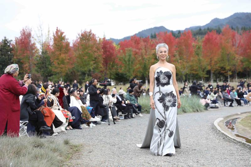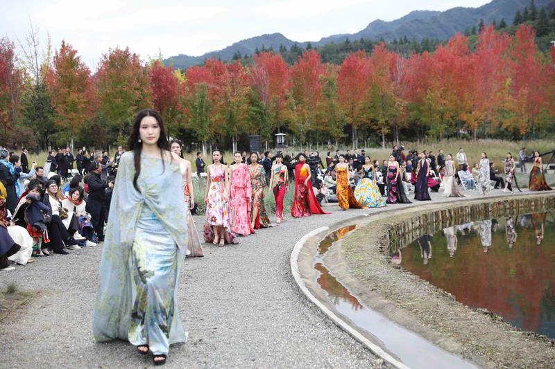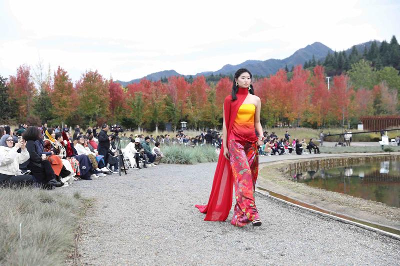 在“生态艺术大秀”展演中,创作者以秦岭为灵感核心,以丝绸为卷,将秦岭的文化与精神凝练为衣,将秦岭四季流转融于细腻设计之中,模特翩然行走于山水实景之中,宛如流动的“生态使者”,成为连接人文、艺术与自然的诗意纽带。